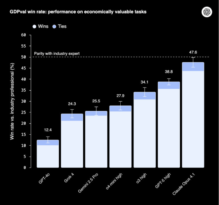 AI-modeller presterar nu lika bra som yrkesexperter i ungefär hälften av professionella arbetsuppgifter, en tredubblad förbättring på bara 15 månader.
